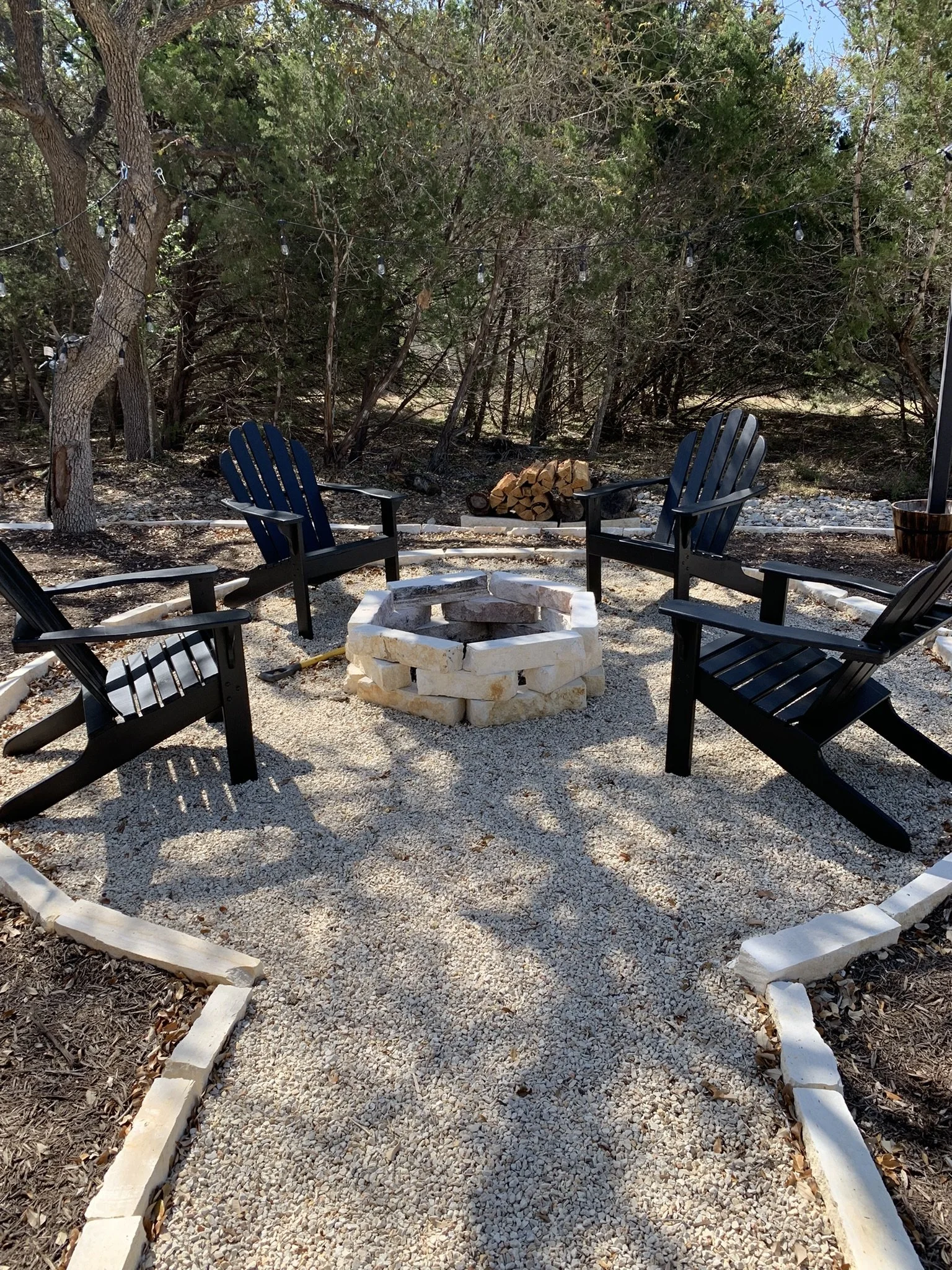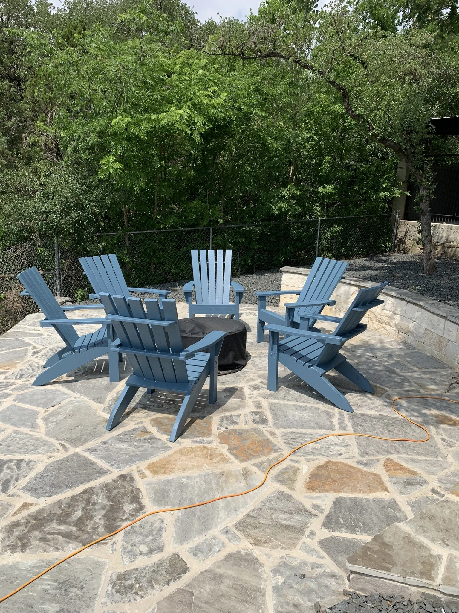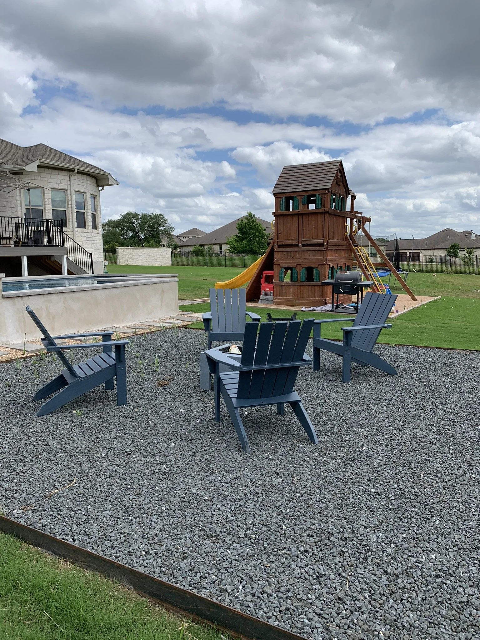 Traditional chairs located around new firepit and stained Black to match house trim